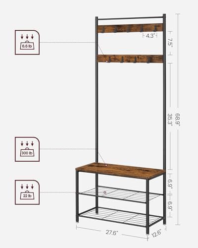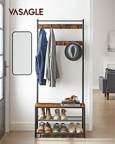 Upgrade your entryway with the VASAGLE Coat Rack, a versatile 3-in-1 hall tree that combines a sturdy steel frame, spacious shoe bench, and nine rust-resistant hooks for organizing coats, bags, and more. With its attractive rustic brown and black finish, this entryway essential offers both style and stability—supporting up to 300 lbs and featuring adjustable feet for extra security. The easy-to-assemble design makes it perfect for any home, keeping your space tidy and inviting while ensuring all your to-go items are always easily accessible.