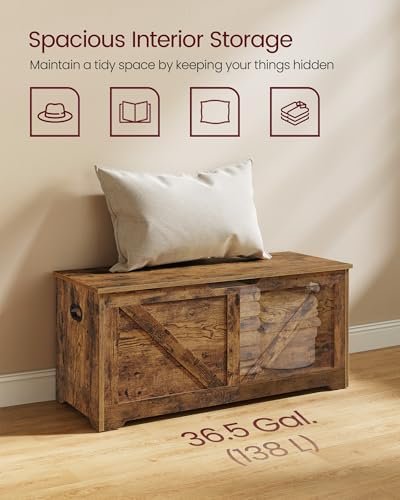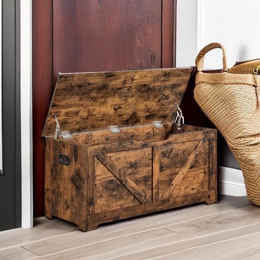 The VASAGLE Storage Chest is a stylish and practical storage bench designed for any entryway, bedroom, or living room. With its spacious compartment and sturdy build—supporting up to 300 lbs—this farmhouse-style trunk easily organizes blankets, shoes, and more. Safety is paramount with two secure hinges to prevent accidents, while wide side handles ensure easy mobility. Simple assembly and a rustic brown finish make this storage solution from VASAGLE both functional and inviting for any home.