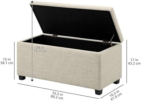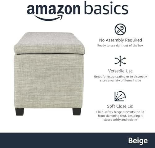 The Amazon Basics Upholstered Storage Rectangular Ottoman and Entryway Bench is a versatile and stylish addition to any home, offering both comfortable seating and ample hidden storage. Its lift-up lid with a soft-close, child-safe hinge gives you easy access to books, blankets, or shoes, while the sturdy hardwood frame ensures long-lasting durability. With no assembly required and easy spot-cleaning, this beige bench is perfect for your entryway, living room, or bedroom. Upgrade your space effortlessly with this practical and elegant piece from the Amazon Basics Store.