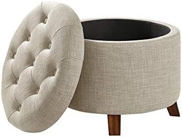 Upgrade your living space with the Amazon Basics Round Linen Ottoman with Storage, a versatile and stylish piece perfect for any room. This tufted, upholstered footstool features a plush foam cushion for comfort and a hidden storage compartment to keep your space tidy. Built with a sturdy wood frame and tapered legs, it supports up to 300 pounds and fits easily into small spaces. Add functionality and timeless design to your home with this must-have from Amazon Basics.