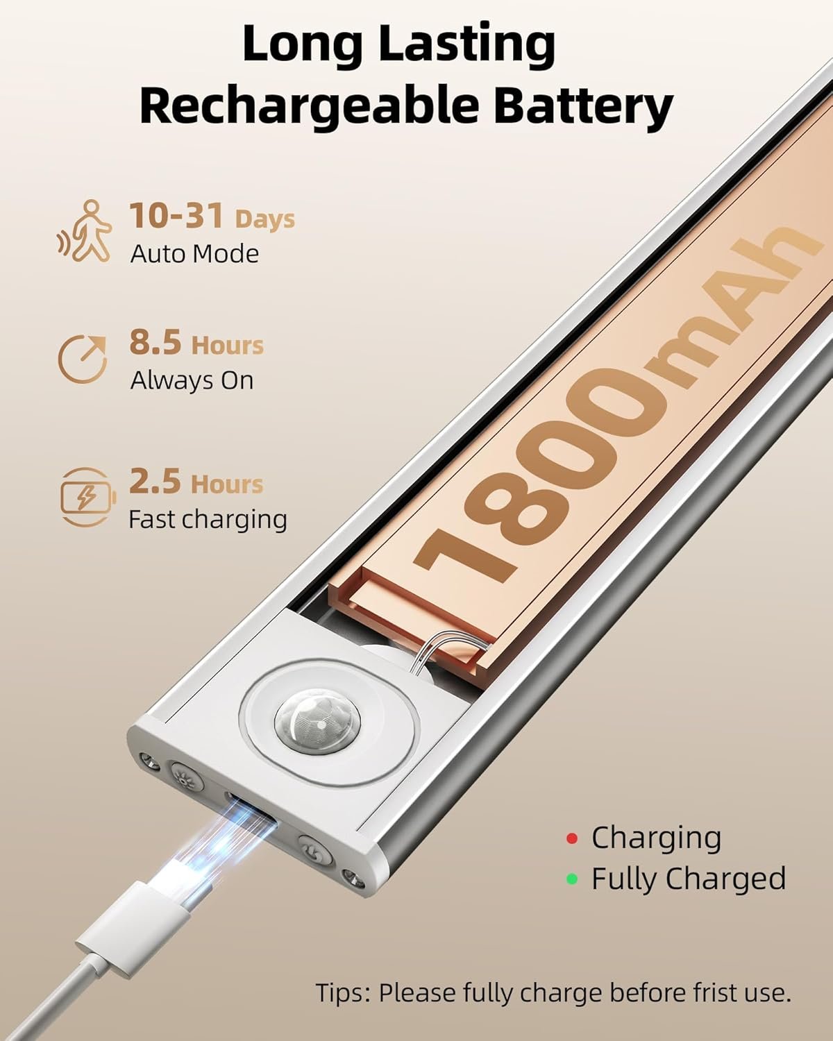 Under Cabinet LED Lighting – Wireless Rechargeable Motion Sensor Light Bar (USB-C, Dimmable, Easy Install)